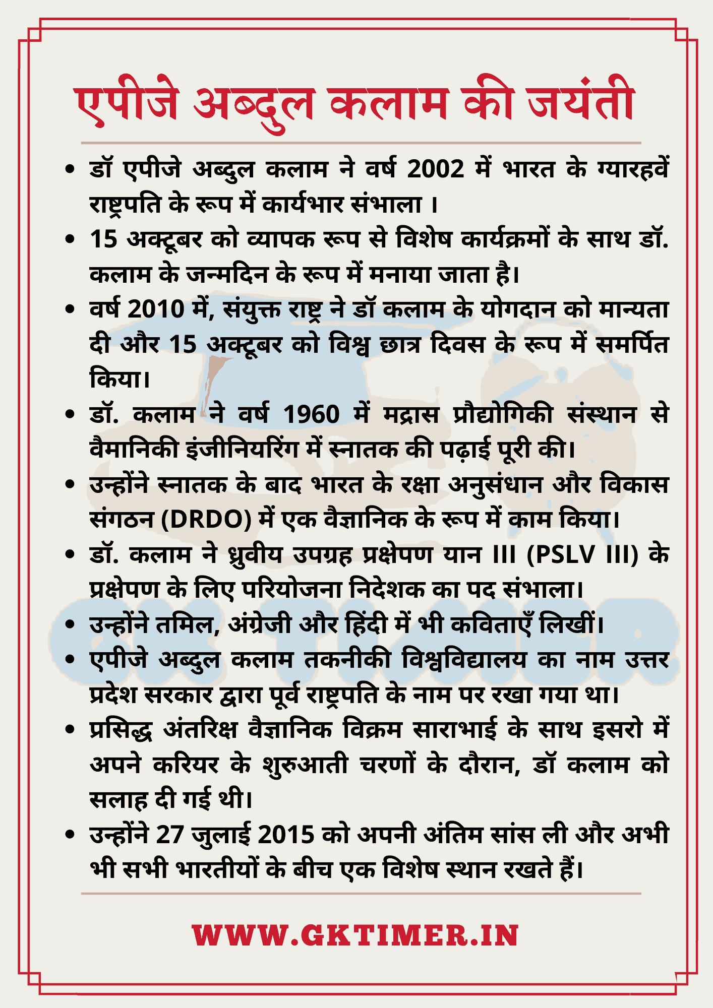 - वर्ष 2010 में, संयुक्त राष्ट्र ने डॉ कलाम के योगदान को मान्यता दी और 15 अक्टूबर को विश्व छात्र दिवस के रूप में समर्पित किया।