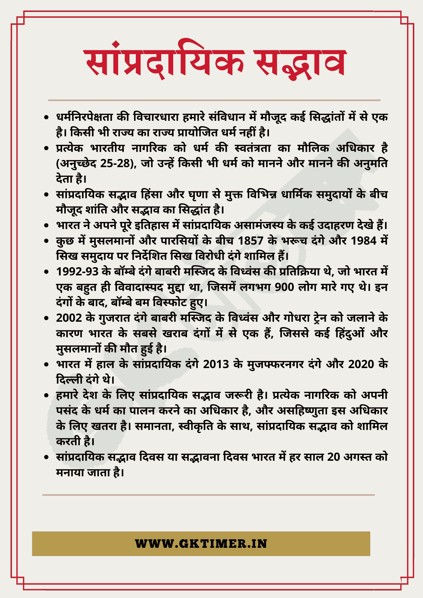 - सांप्रदायिक सद्भाव हिंसा और घृणा से मुक्त विभिन्न धार्मिक समुदायों के बीच मौजूद शांति और सद्भाव का सिद्धांत है।