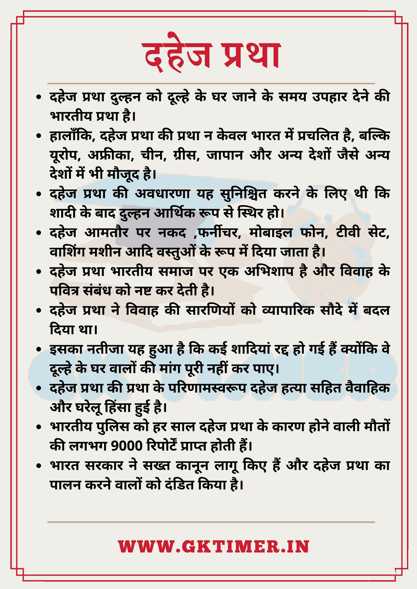 - दहेज प्रथा भारत में प्रचलित पारंपरिक सामाजिक बुराई है।
