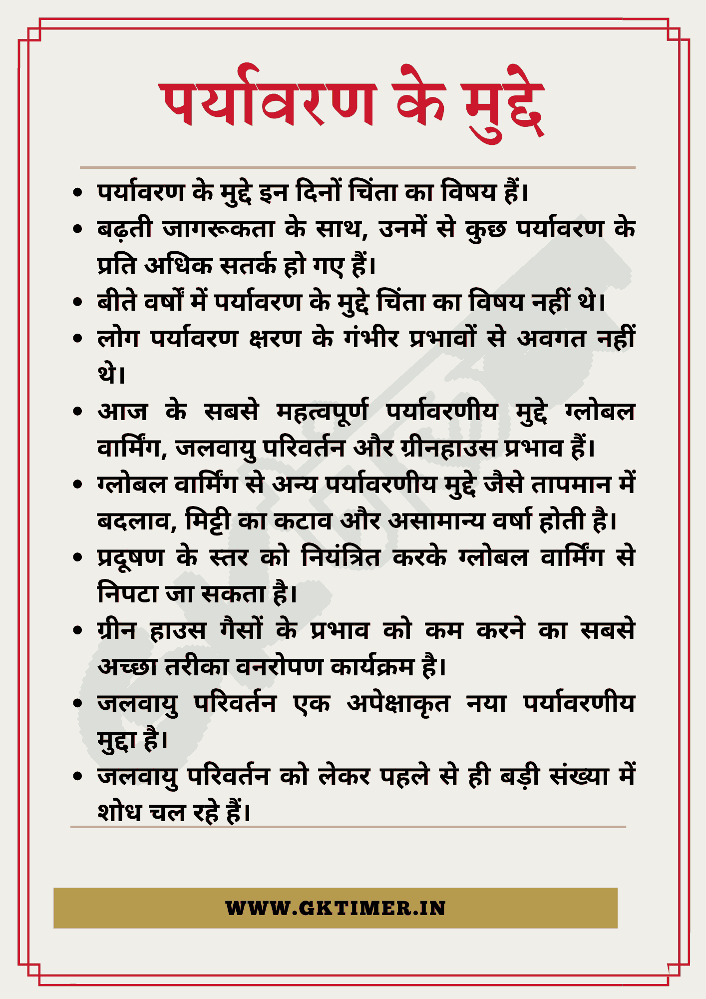 - आज के सबसे महत्वपूर्ण पर्यावरणीय मुद्दे ग्लोबल वार्मिंग, जलवायु परिवर्तन और ग्रीनहाउस प्रभाव हैं।