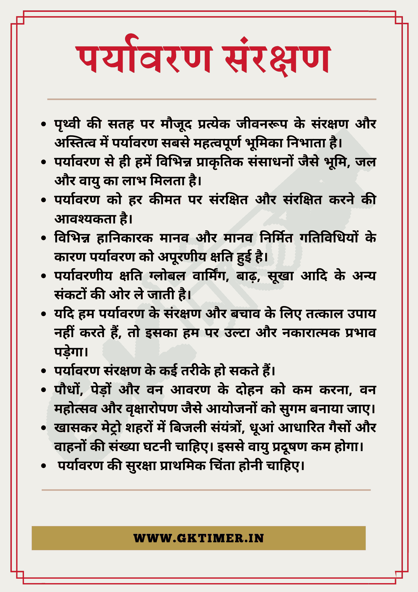 - पृथ्वी की सतह पर मौजूद प्रत्येक जीवनरूप के संरक्षण और अस्तित्व में पर्यावरण सबसे महत्वपूर्ण भूमिका निभाता है।