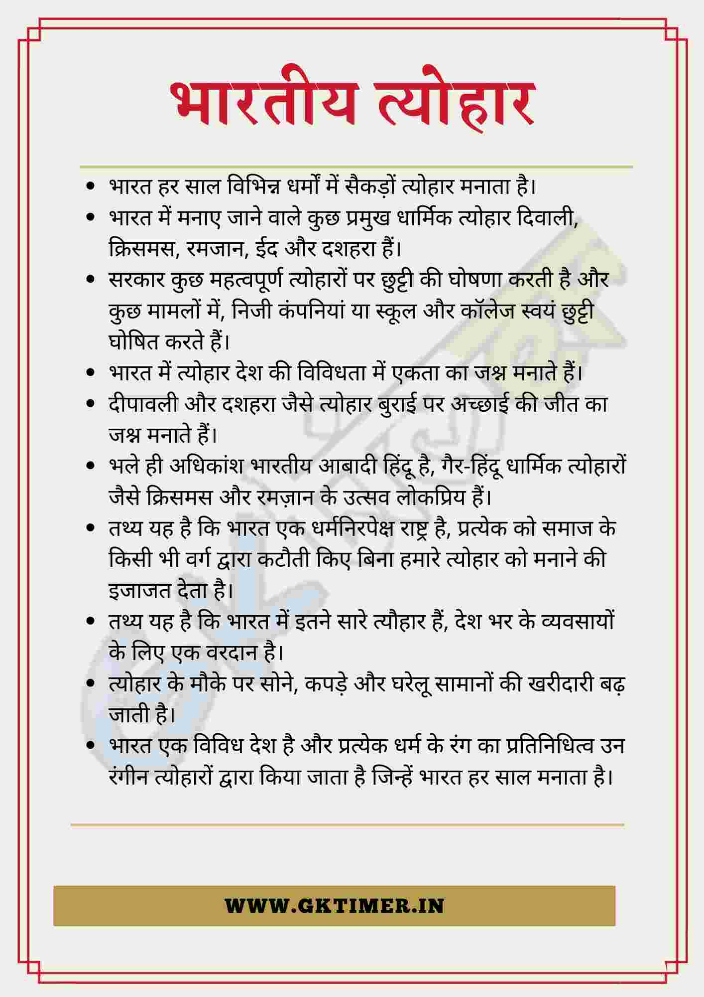 Indian Festivals Essay in Hindi :  इस लेख में हमने भारतीय त्योहारों पर निबंध के बारे में जानकारी प्रदान की है। यहाँ पर दी गई जानकारी बच्चों से लेकर प्रतियोगी परीक्षाओं के तैयारी करने वाले छात्रों के लिए उपयोगी साबित होगी।