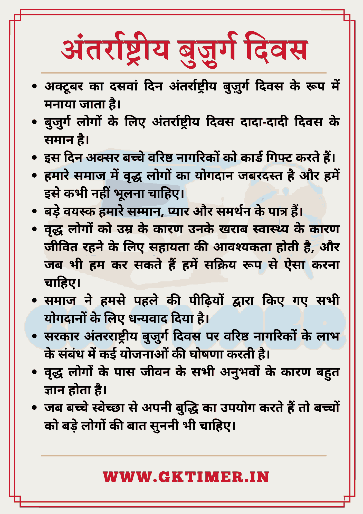 - अक्टूबर का दसवां दिन अंतर्राष्ट्रीय बुज़ुर्ग दिवस के रूप में मनाया जाता है।