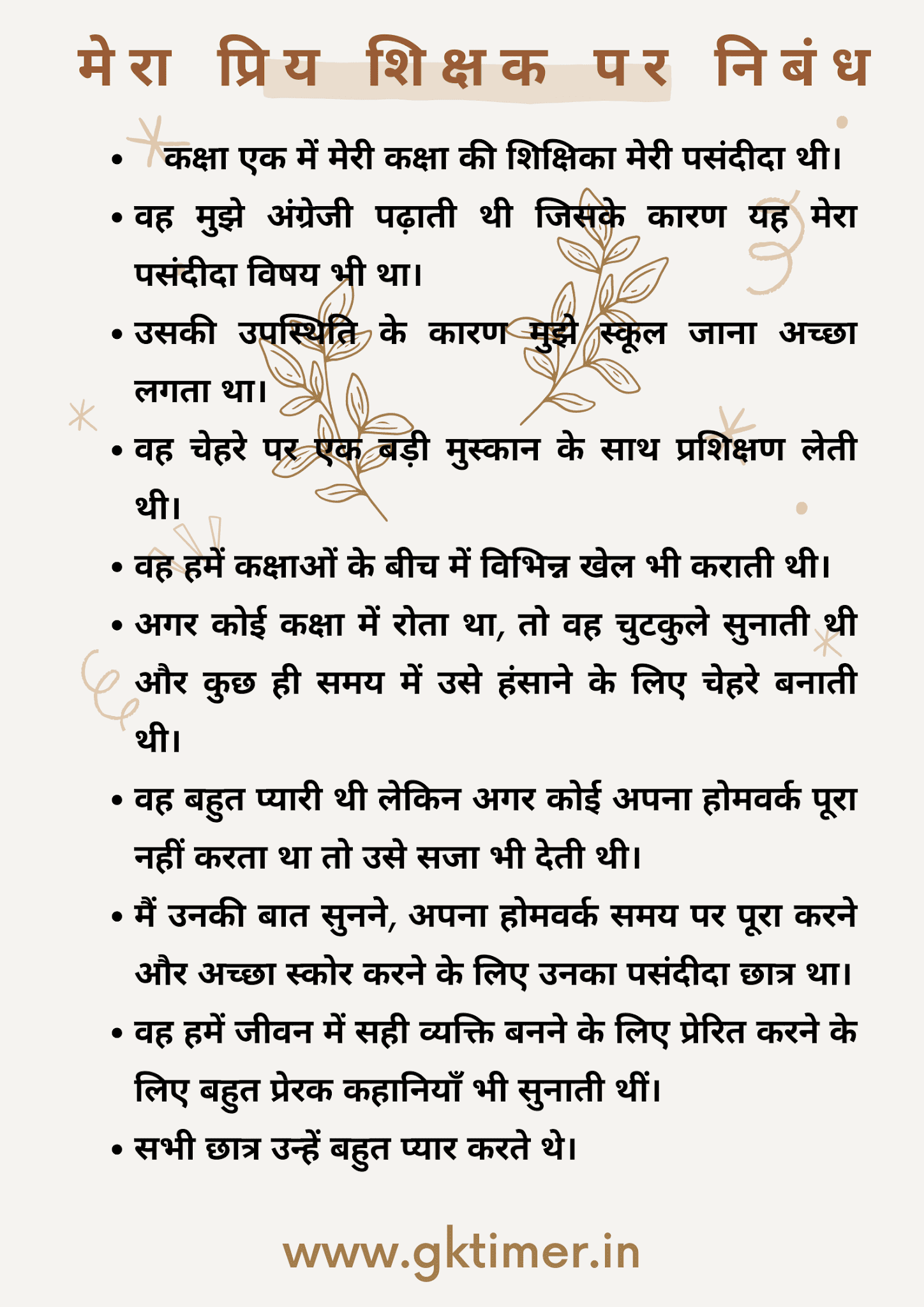 Essay on My Favourite Teacher in Hindi : इस लेख में हमने मेरा प्रिय अध्यापक के बारे में जानकारी प्रदान की है। यहाँ पर दी गई जानकारी बच्चों से लेकर प्रतियोगी परीक्षाओं के तैयारी करने वाले छात्रों के लिए उपयोगी साबित होगी।