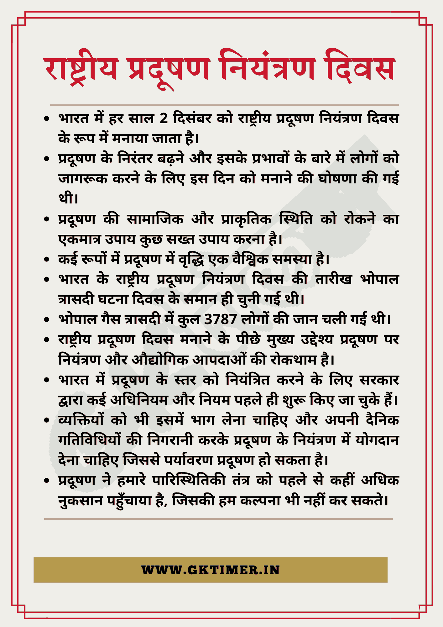 - यही कारण है कि दिसंबर महीने के दूसरे दिन को भारत में राष्ट्रीय प्रदूषण दिवस के रूप में मनाया जाता है।