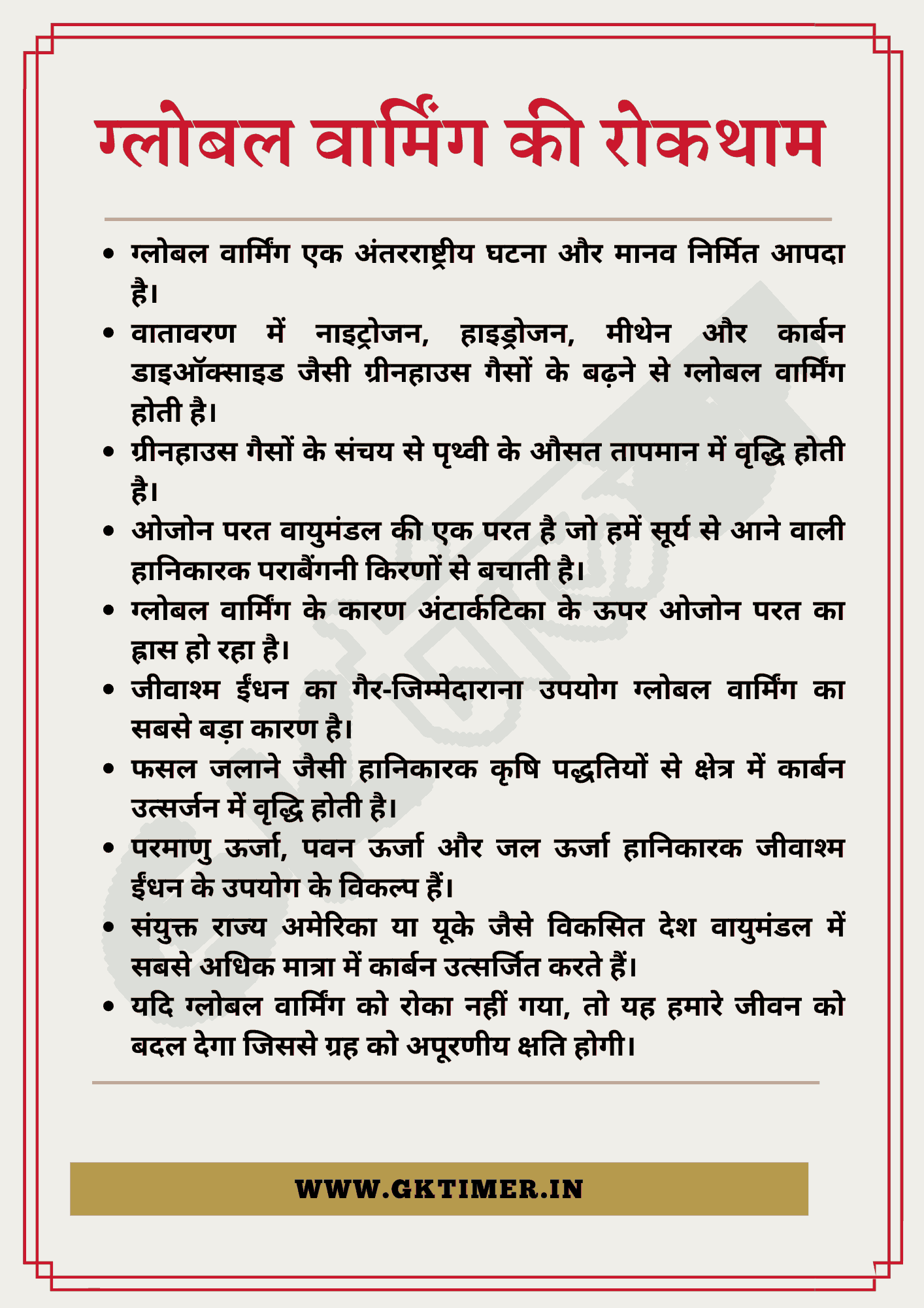 - यदि ग्लोबल वार्मिंग को रोका नहीं गया, तो यह हमारे जीवन को बदल देगा जिससे ग्रह को अपूरणीय क्षति होगी।