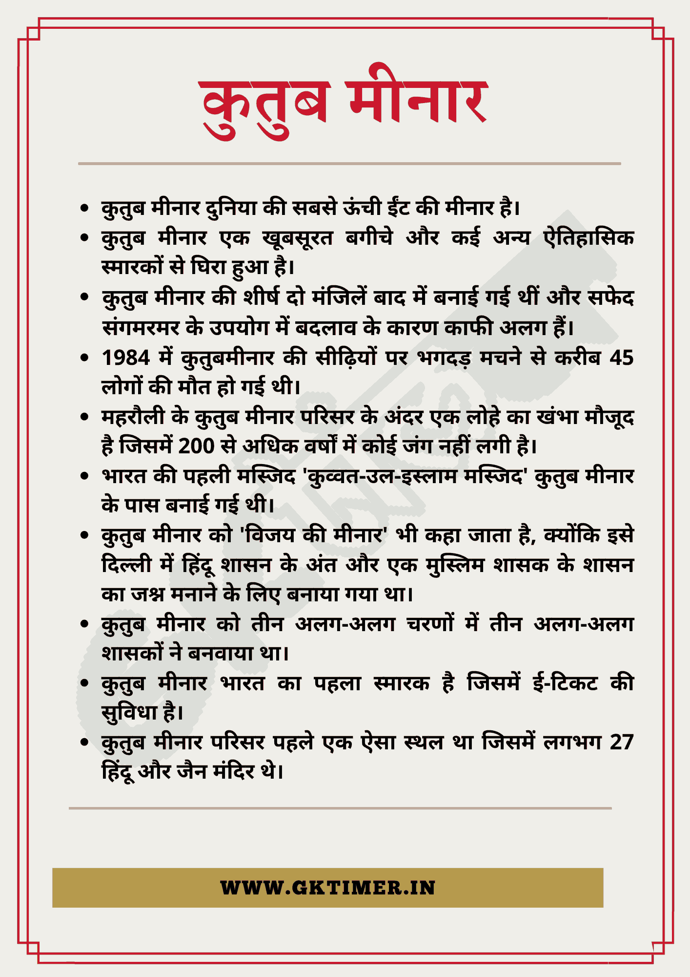 - कुतुब मीनार दुनिया की सबसे ऊंची ईंट की मीनार है।