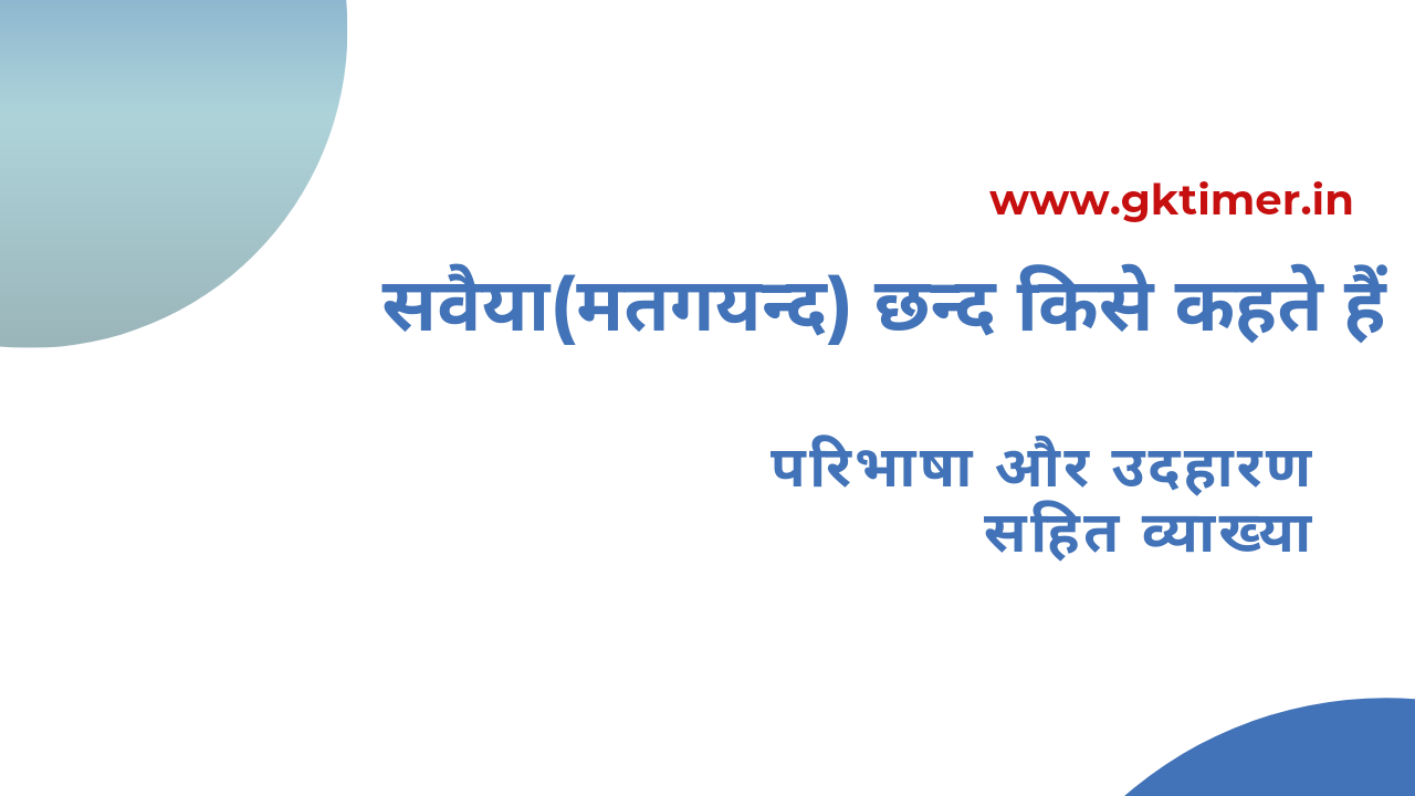प्रिय, पाठकों आज की इस पोस्ट में हमने सवैया छन्द के बारे में जानकारी प्रदान की है। आशा करते हैं कि आपको सवैया छन्द की परिभाषा तथा सवैया छन्द के उदाहरण सहित यह जानकारी पसंद आएगी।