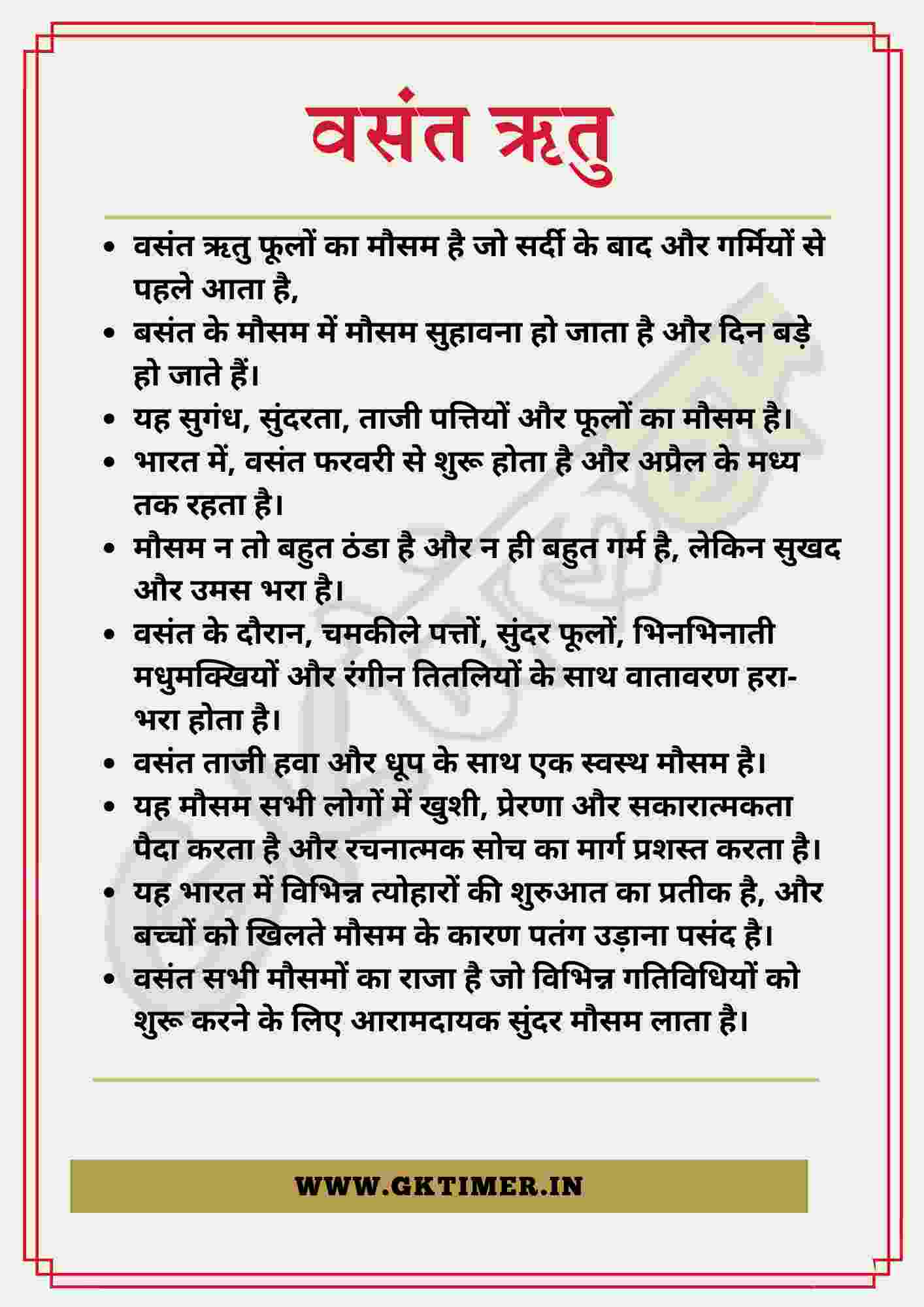 - भारत में वसंत फरवरी में होता है और अप्रैल के मध्य तक रहता है।