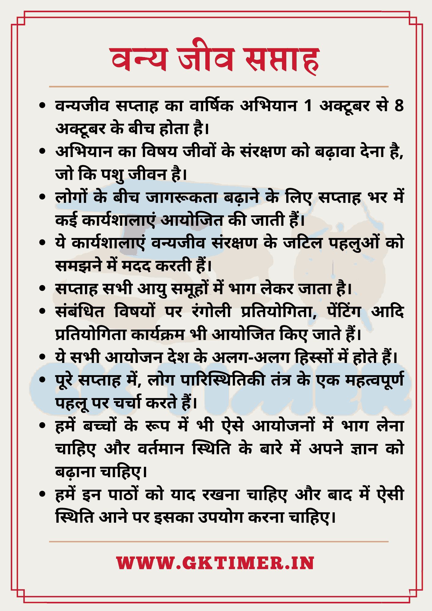 - वन्यजीव सप्ताह का वार्षिक अभियान 1 अक्टूबर से 8 अक्टूबर के बीच होता है।