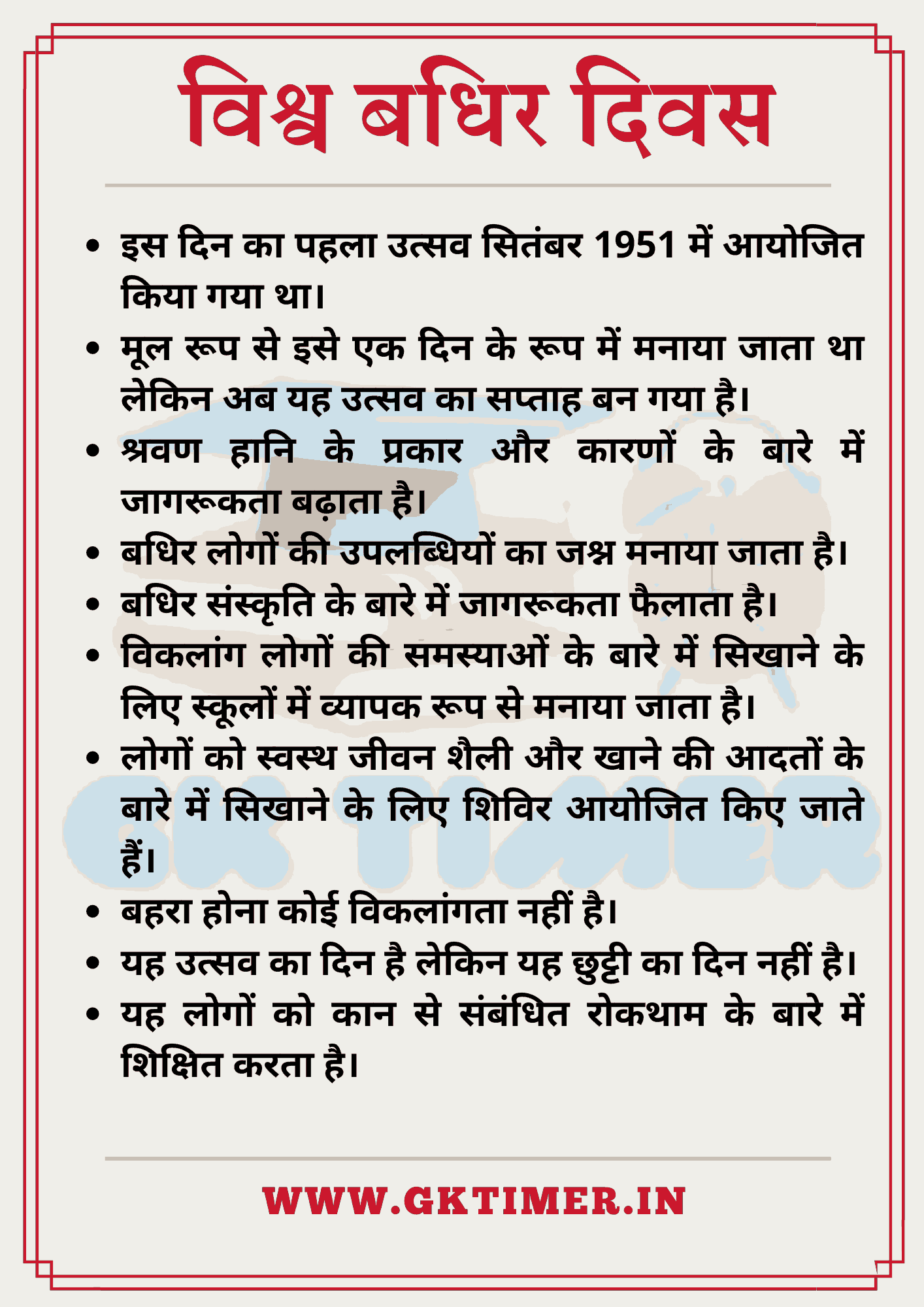 - यह दिन बधिर लोगों के लिए आत्मसम्मान, स्वस्थ जीवन और शिक्षा को भी बढ़ावा देता है।