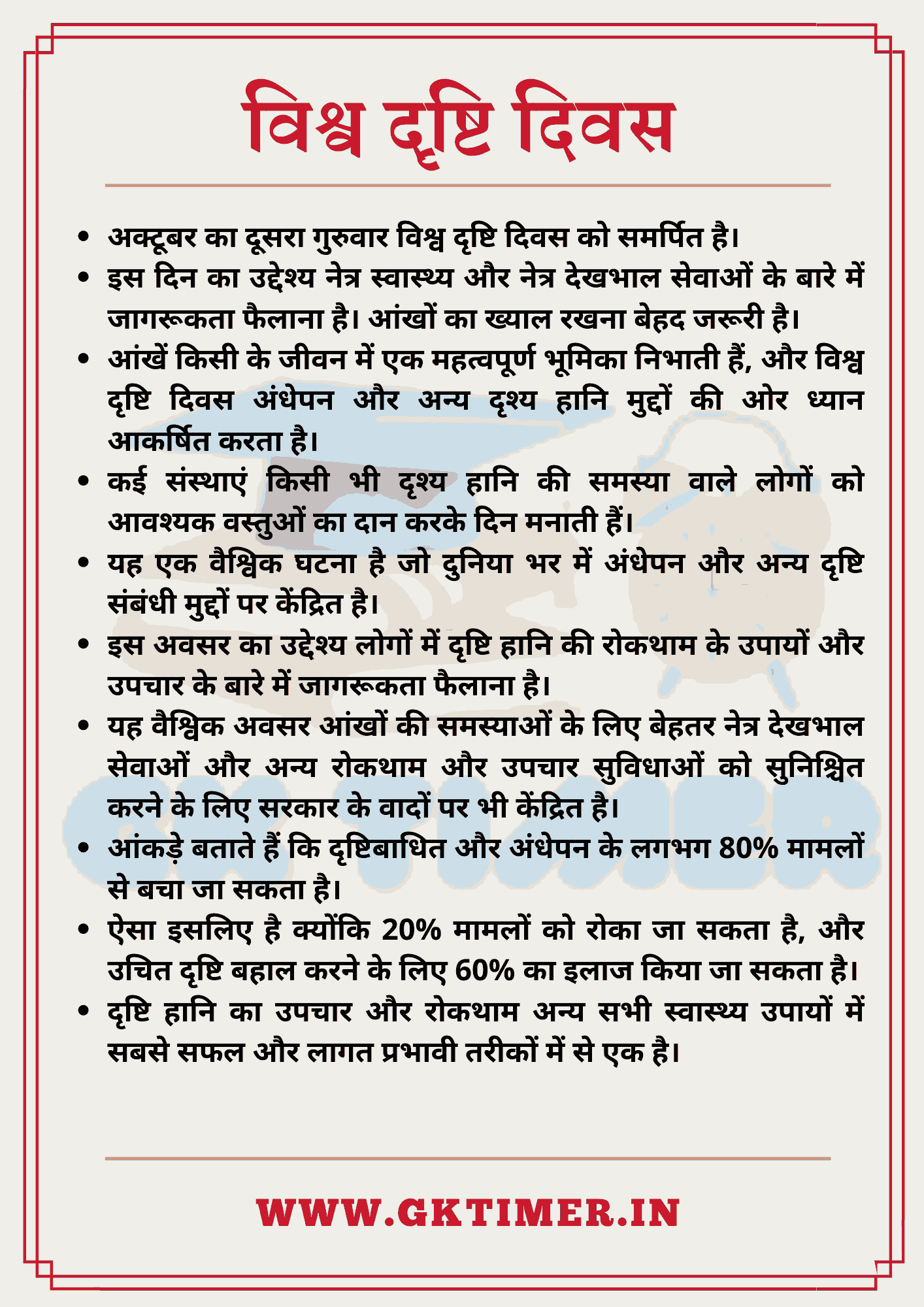 - अक्टूबर का दूसरा गुरुवार विश्व दृष्टि दिवस को समर्पित है।